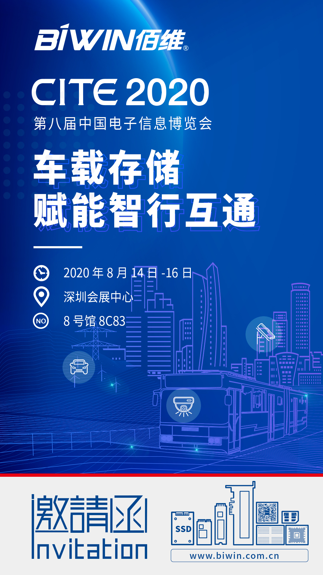 2020年8月14日-8月16日,第八屆中國電子信息博覽會(CITE 2020)將在深圳會展中心舉辦,此次博覽會共有9個展館,其中智能網(wǎng)聯(lián)與新能源汽車領域備受關注。作為國內領先的存儲芯片全案提供商,佰維受邀參展并以“車載存儲·賦能智行互通”為主題,全面展示在車載領域的存儲解決方案。