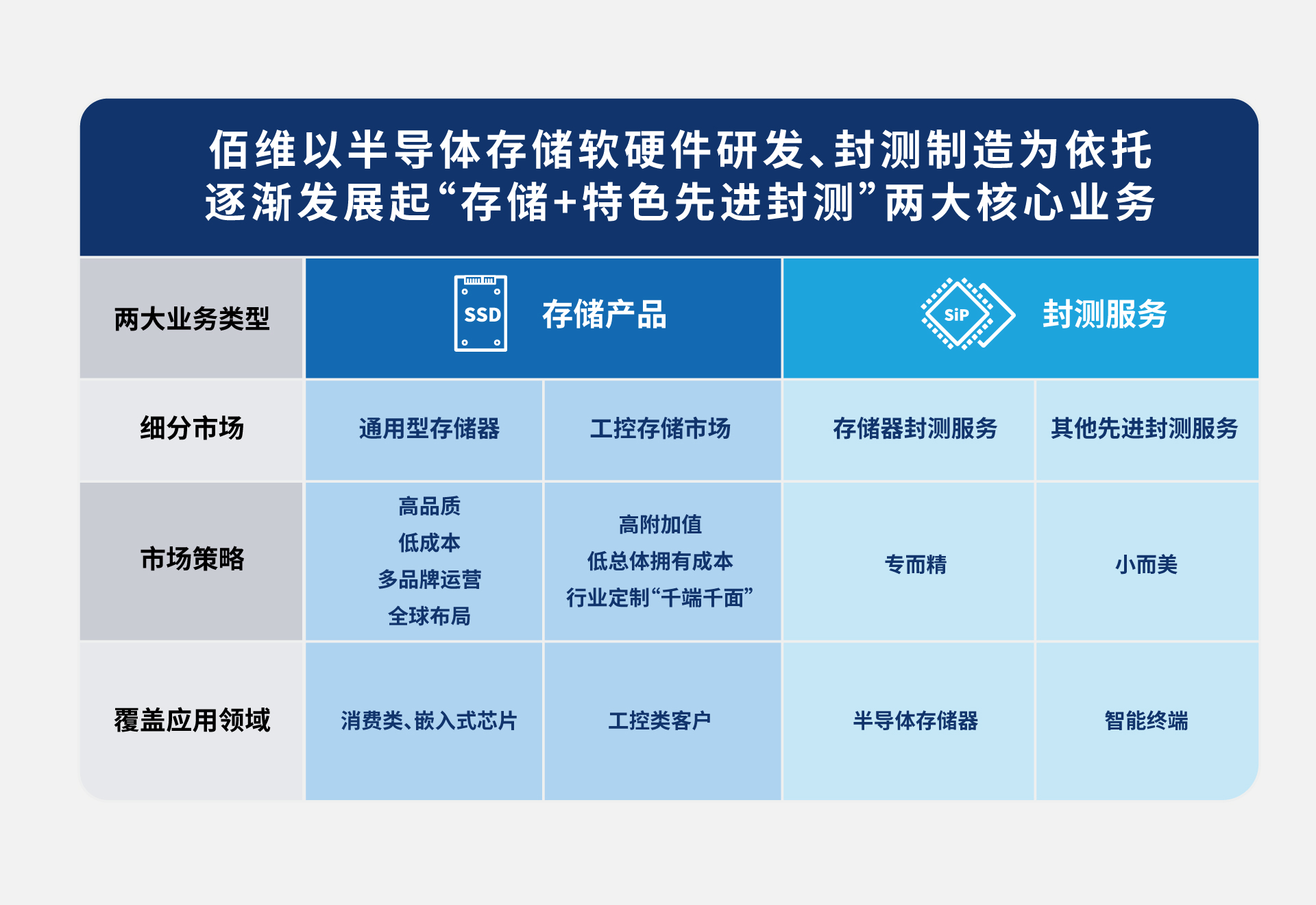 佰維多年來專精于半導體存儲器的創(chuàng)新研發(fā)與封測制造,布局了全系列、全容量、全場景應用的存儲產(chǎn)品線矩陣,涵蓋了標準化、規(guī)模化的通用型存儲器以及“千端千面”的行業(yè)定制化方案,最終實現(xiàn)從客戶端需求開發(fā)到最終產(chǎn)品端量產(chǎn)的一站式交付能力。佰維是國內(nèi)最早布局封測制造的存儲企業(yè),優(yōu)異的封測制造工藝賦予了公司更靈活的和快速響應的定制化優(yōu)勢,通過研發(fā)與封測實力不斷賦能存儲芯片小型化、大容量與低功耗,進而滿足終端設(shè)備日益輕薄與高集成度的需求。