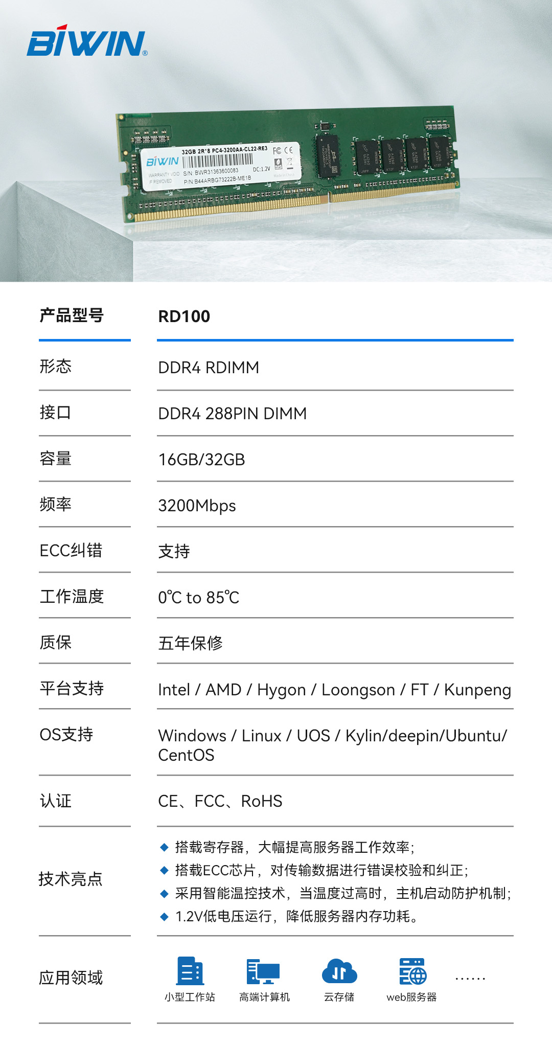 在內(nèi)外部測(cè)試系統(tǒng)的加持下,佰維RD100系列DDR4 RDIMM各項(xiàng)性能得以保證。目前,佰維RD100系列服務(wù)器內(nèi)存已經(jīng)進(jìn)入量產(chǎn)階段。后續(xù),佰維將緊跟5G、大數(shù)據(jù)、AI以及云計(jì)算等技術(shù)的發(fā)展趨勢(shì),推出更多企業(yè)級(jí)應(yīng)用內(nèi)存、SSD模組,為客戶提供更多高品質(zhì)的存儲(chǔ)產(chǎn)品選型方案。