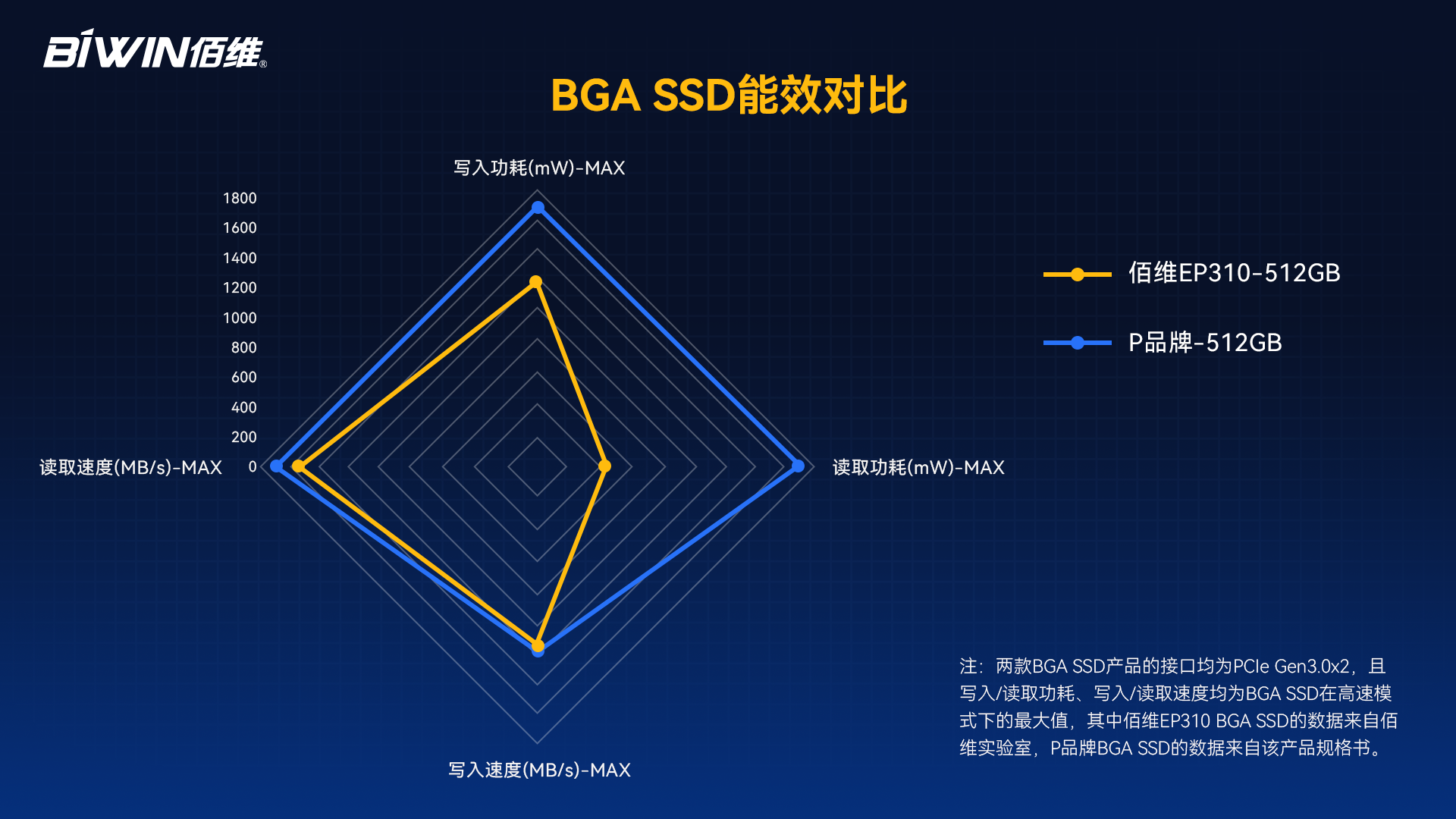 以BIWIN BGA SSD EP310(PCIe Gen3.0x2)為例,得益于公司核心固件算法等研發(fā)能力的支持,該款產(chǎn)品在能效比和功耗方面的表現(xiàn)優(yōu)于P品牌的同代產(chǎn)品。對于需要高頻次、長時間使用的移動智能終端設(shè)備來說,高能效比與低功耗能為設(shè)備提速減負,提升產(chǎn)品競爭力。