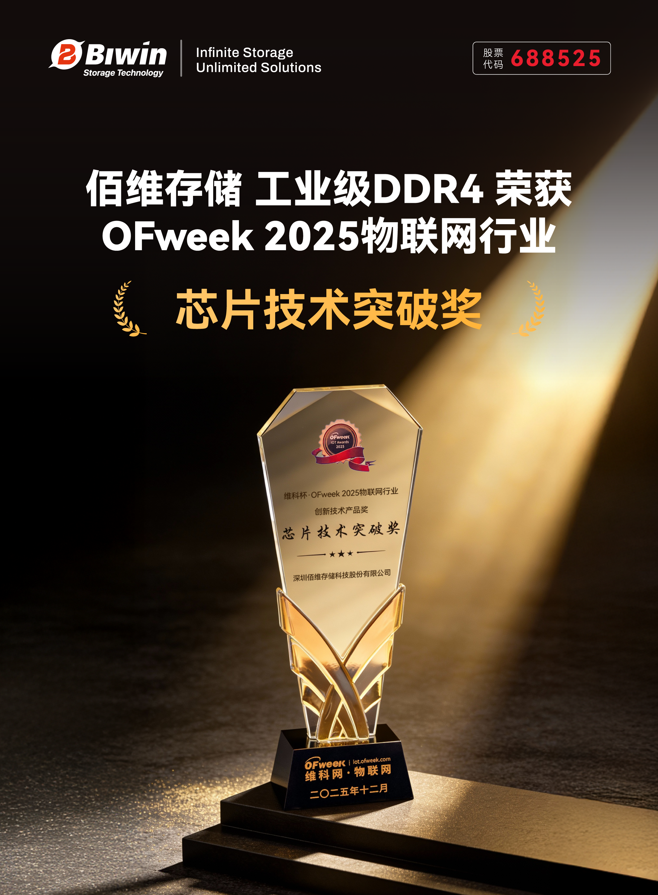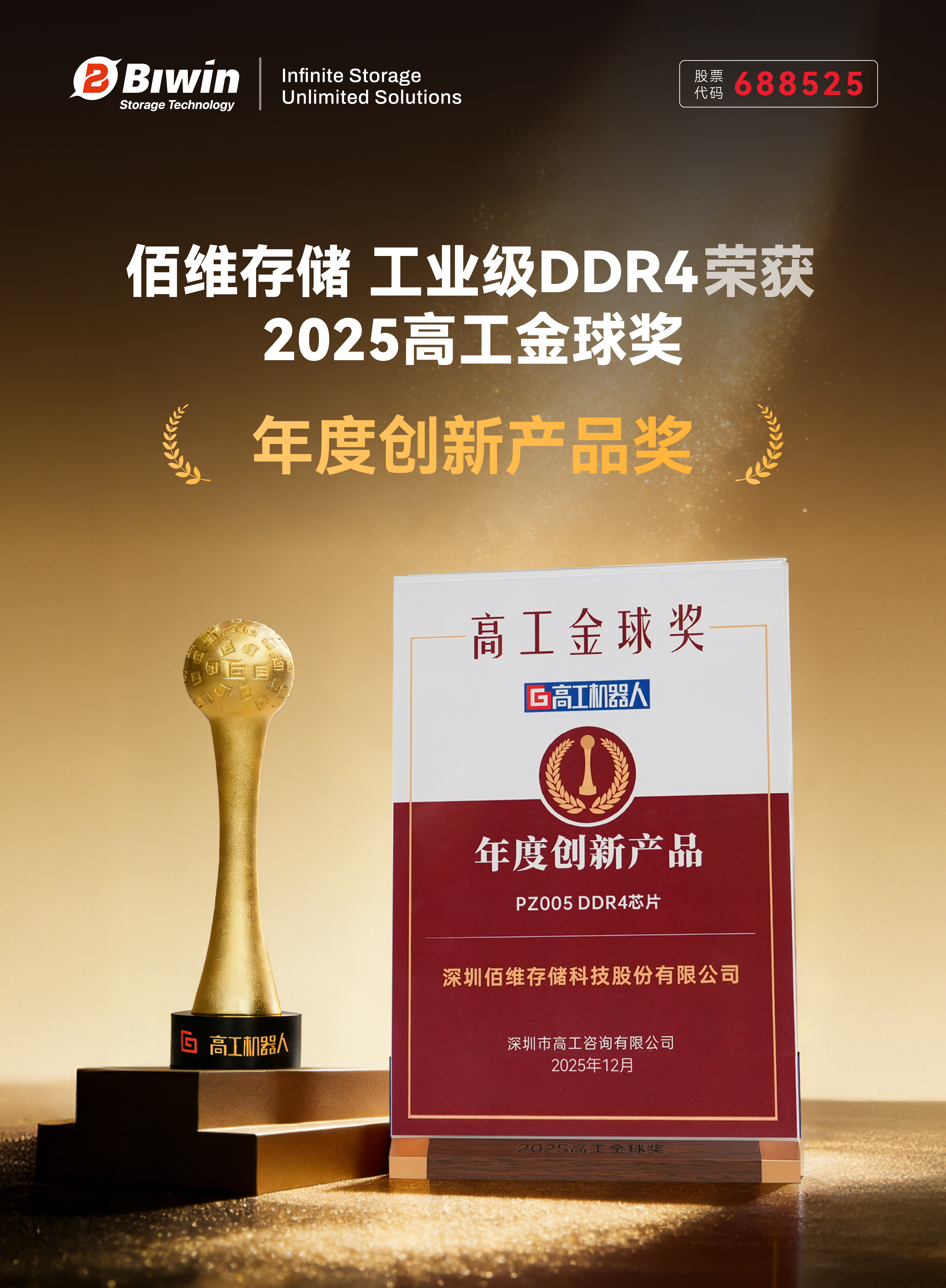 近日,佰維旗下工業(yè)車規(guī)存儲品牌佰維特存推出的 PZ005 系列工業(yè)級寬溫 DDR4 憑借穩(wěn)定可靠的工業(yè)級性能和在國產存儲技術突破中的關鍵貢獻,榮獲 2025高工機器人金球獎“年度創(chuàng)新產品” 與 OFweek 2025物聯網行業(yè)“年度創(chuàng)新技術產品獎——芯片技術突破獎” 兩項殊榮,充分彰顯了公司在核心技術實力、市場落地能力及產業(yè)創(chuàng)新價值方面的領先優(yōu)勢。