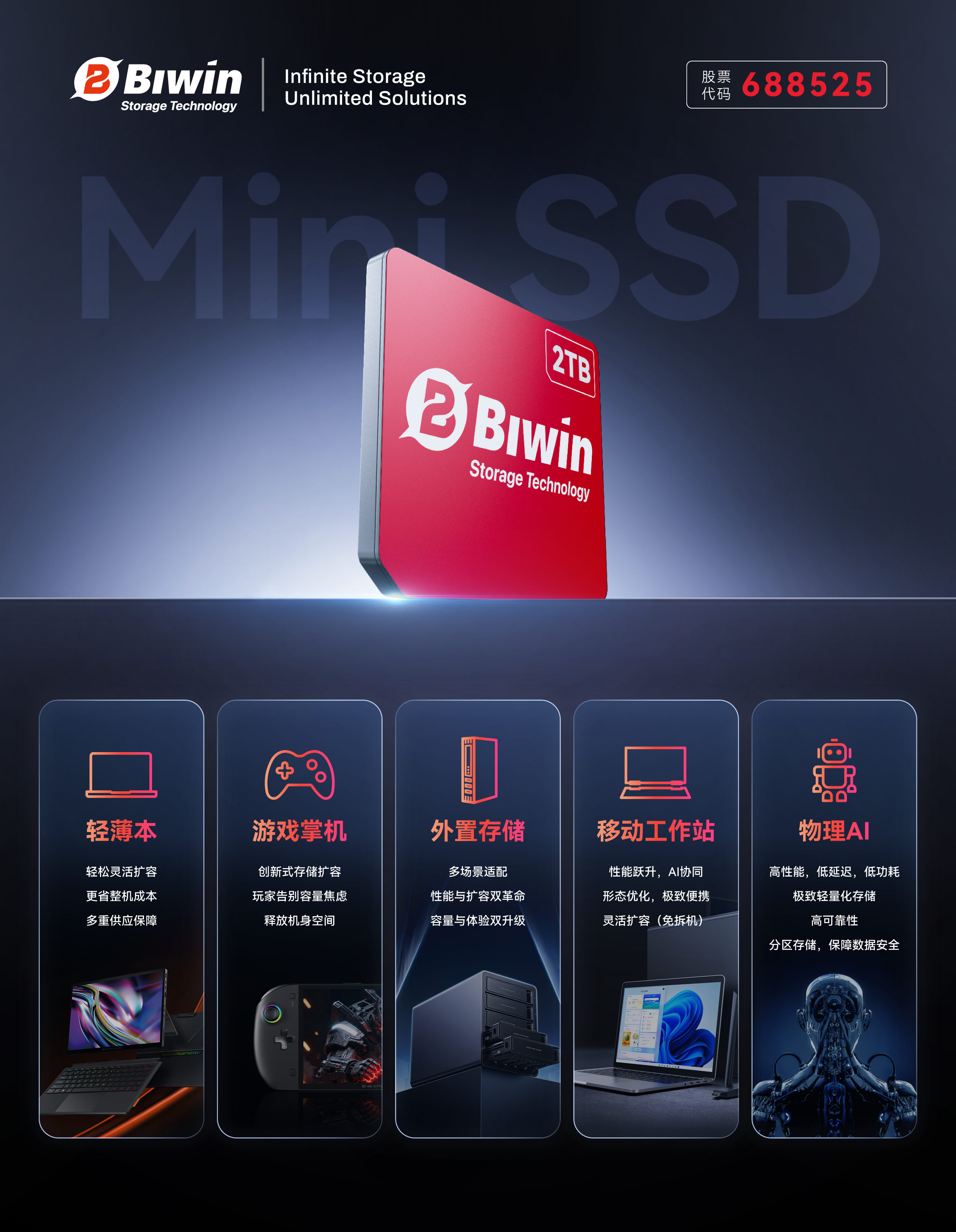 佰維存儲產品總監(jiān)王慧蓮進一步闡述,Mini SSD精準聚焦超薄本、游戲掌機、外置存儲、移動工作站、物理AI五大核心應用場景,為終端創(chuàng)新提供核心驅動力。